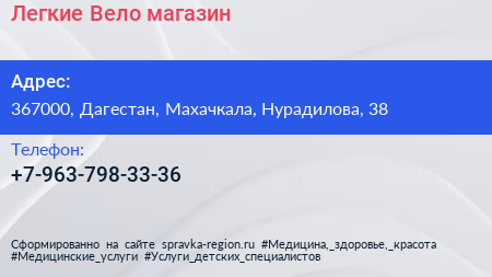 Легкие Вело, магазин по адресу 367000, Дагестан, Махачкала, Нурадилова, 38 в дальнейшем Организация, размещена в следующих категориях: