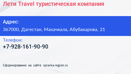 Лети Travel, туристическая компания по адресу 367000, Дагестан, Махачкала, Абубакарова, 21 в дальнейшем Организация, размещена в следующих категориях:
