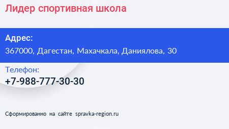 Лидер, спортивная школа по адресу 367000, Дагестан, Махачкала, Даниялова, 30 в дальнейшем Организация, размещена в следующих категориях: