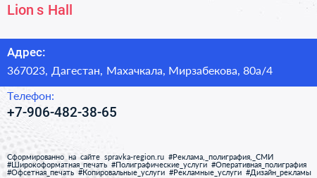 Lion`s Hall по адресу 367023, Дагестан, Махачкала, Мирзабекова, 80а/4 в дальнейшем Организация, размещена в следующих категориях: