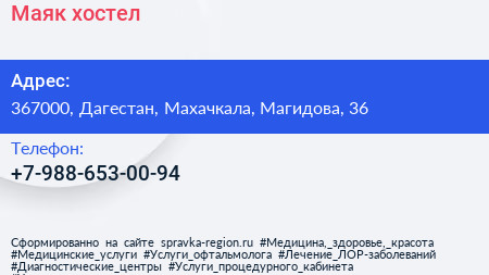 Маяк, хостел по адресу 367000, Дагестан, Махачкала, Магидова, 36 в дальнейшем Организация, размещена в следующих категориях: