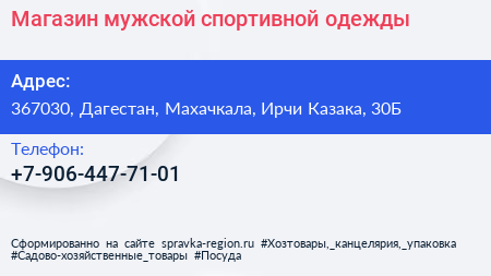 Магазин мужской спортивной одежды по адресу 367030, Дагестан, Махачкала, Ирчи Казака, 30Б в дальнейшем Организация, размещена в следующих категориях: