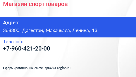 Магазин спорттоваров по адресу 368300, Дагестан, Махачкала, Ленина, 13 в дальнейшем Организация, размещена в следующих категориях: