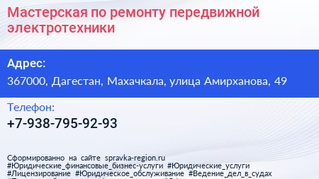 Мастерская по ремонту передвижной электротехники по адресу 367000, Дагестан, Махачкала, улица Амирханова, 49 в дальнейшем Организация, размещена в следующих категориях: