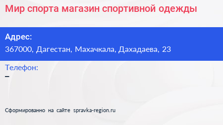 Мир спорта, магазин спортивной одежды по адресу 367000, Дагестан, Махачкала, Дахадаева, 23 в дальнейшем Организация, размещена в следующих категориях: