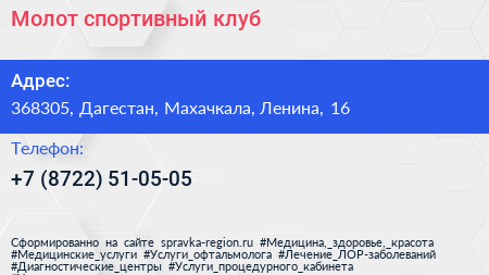 Молот, спортивный клуб по адресу 368305, Дагестан, Махачкала, Ленина, 16 в дальнейшем Организация, размещена в следующих категориях: