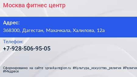 Москва, фитнес-центр по адресу 368300, Дагестан, Махачкала, Халилова, 12а в дальнейшем Организация, размещена в следующих категориях: