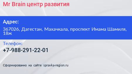 Mr.Brain, центр развития по адресу 367026, Дагестан, Махачкала, проспект Имама Шамиля, 18ж в дальнейшем Организация, размещена в следующих категориях: