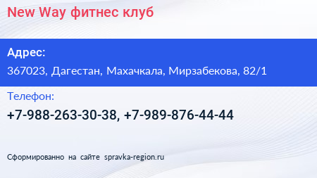 New Way, фитнес-клуб по адресу 367023, Дагестан, Махачкала, Мирзабекова, 82/1 в дальнейшем Организация, размещена в следующих категориях: