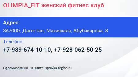 OLIMPIA_FIT, женский фитнес-клуб по адресу 367000, Дагестан, Махачкала, Абубакарова, 8 в дальнейшем Организация, размещена в следующих категориях: