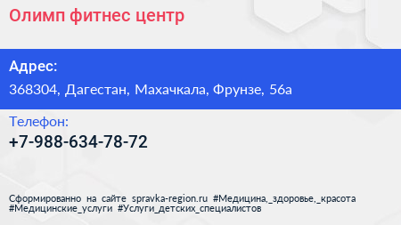 Олимп, фитнес-центр по адресу 368304, Дагестан, Махачкала, Фрунзе, 56а в дальнейшем Организация, размещена в следующих категориях: