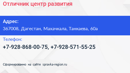 Отличник, центр развития по адресу 367008, Дагестан, Махачкала, Танкаева, 60а в дальнейшем Организация, размещена в следующих категориях: