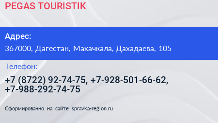 PEGAS TOURISTIK по адресу 367000, Дагестан, Махачкала, Дахадаева, 105 в дальнейшем Организация, размещена в следующих категориях: