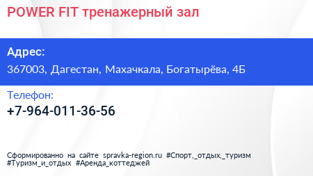 POWER FIT, тренажерный зал по адресу 367003, Дагестан, Махачкала, Богатырёва, 4Б в дальнейшем Организация, размещена в следующих категориях:
