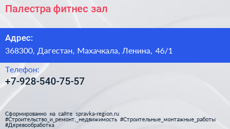 Палестра, фитнес зал по адресу 368300, Дагестан, Махачкала, Ленина, 46/1 в дальнейшем Организация, размещена в следующих категориях: