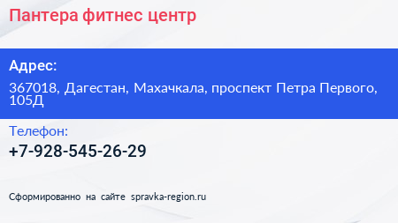 Пантера, фитнес центр по адресу 367018, Дагестан, Махачкала, проспект Петра Первого, 105Д в дальнейшем Организация, размещена в следующих категориях:
