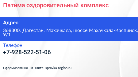 Патима, оздоровительный комплекс по адресу 368300, Дагестан, Махачкала, шоссе Махачкала-Каспийск, 9/1 в дальнейшем Организация, размещена в следующих категориях:
