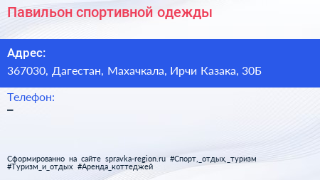 Павильон спортивной одежды по адресу 367030, Дагестан, Махачкала, Ирчи Казака, 30Б в дальнейшем Организация, размещена в следующих категориях: