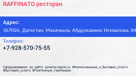RAFFINATO, ресторан по адресу 367026, Дагестан, Махачкала, Абдулхакима Исмаилова, 84 в дальнейшем Организация, размещена в следующих категориях:
