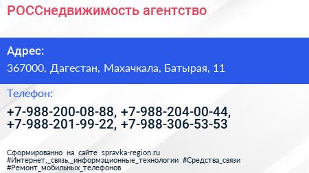 РОССнедвижимость, агентство по адресу 367000, Дагестан, Махачкала, Батырая, 11 в дальнейшем Организация, размещена в следующих категориях: