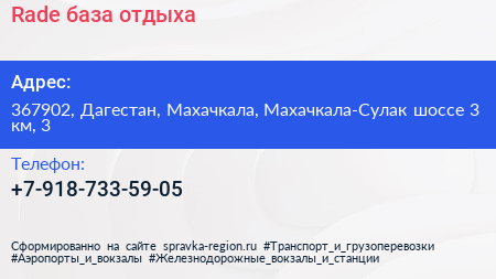 Rade, база отдыха по адресу 367902, Дагестан, Махачкала, Махачкала-Сулак шоссе 3 км, 3 в дальнейшем Организация, размещена в следующих категориях: