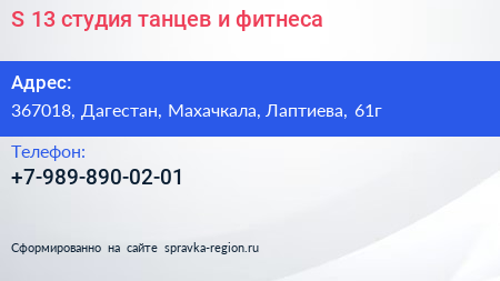 S-13, студия танцев и фитнеса по адресу 367018, Дагестан, Махачкала, Лаптиева, 61г в дальнейшем Организация, размещена в следующих категориях: