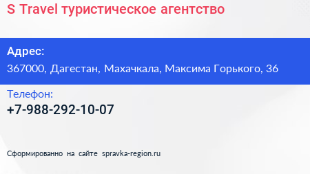 S Travel, туристическое агентство по адресу 367000, Дагестан, Махачкала, Максима Горького, 36 в дальнейшем Организация, размещена в следующих категориях: