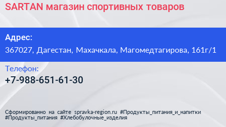 SARTAN, магазин спортивных товаров по адресу 367027, Дагестан, Махачкала, Магомедтагирова, 161г/1 в дальнейшем Организация, размещена в следующих категориях: