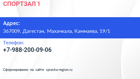 СПОРТЗАЛ №1 по адресу 367009, Дагестан, Махачкала, Каммаева, 19/1 в дальнейшем Организация, размещена в следующих категориях: