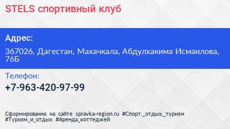 STELS, спортивный клуб по адресу 367026, Дагестан, Махачкала, Абдулхакима Исмаилова, 76Б в дальнейшем Организация, размещена в следующих категориях: