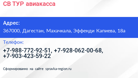 СВ ТУР, авиакасса по адресу 367000, Дагестан, Махачкала, Эффенди Капиева, 18а в дальнейшем Организация, размещена в следующих категориях: