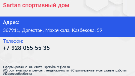 Sartan, спортивный дом по адресу 367911, Дагестан, Махачкала, Казбекова, 59 в дальнейшем Организация, размещена в следующих категориях: