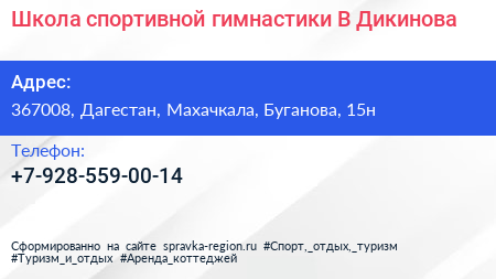 Школа спортивной гимнастики В.Дикинова по адресу 367008, Дагестан, Махачкала, Буганова, 15н в дальнейшем Организация, размещена в следующих категориях: