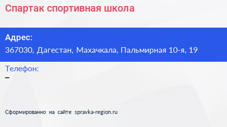 Спартак, спортивная школа по адресу 367030, Дагестан, Махачкала, Пальмирная 10-я, 19 в дальнейшем Организация, размещена в следующих категориях: