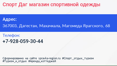 Спорт-Даг, магазин спортивной одежды по адресу 367003, Дагестан, Махачкала, Магомеда Ярагского, 68 в дальнейшем Организация, размещена в следующих категориях: