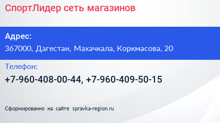 СпортЛидер, сеть магазинов по адресу 367000, Дагестан, Махачкала, Коркмасова, 20 в дальнейшем Организация, размещена в следующих категориях: