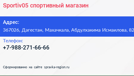 Sportiv05, спортивный магазин по адресу 367026, Дагестан, Махачкала, Абдулхакима Исмаилова, 82 в дальнейшем Организация, размещена в следующих категориях: