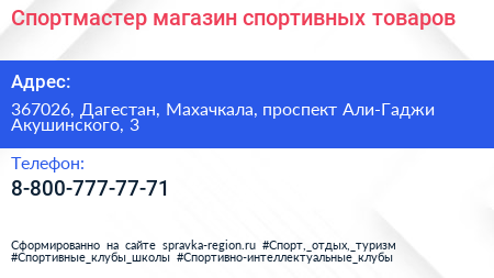 Спортмастер, магазин спортивных товаров по адресу 367026, Дагестан, Махачкала, проспект Али-Гаджи Акушинского, 3 в дальнейшем Организация, размещена в следующих категориях: