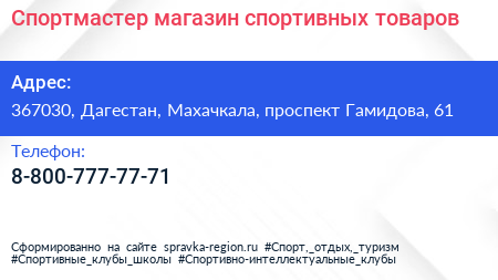 Спортмастер, магазин спортивных товаров по адресу 367030, Дагестан, Махачкала, проспект Гамидова, 61 в дальнейшем Организация, размещена в следующих категориях: