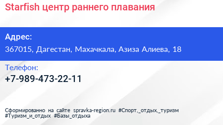 Starfish, центр раннего плавания по адресу 367015, Дагестан, Махачкала, Азиза Алиева, 18 в дальнейшем Организация, размещена в следующих категориях: