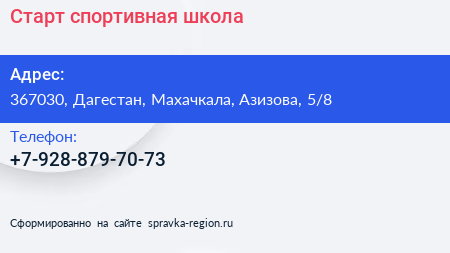Старт, спортивная школа по адресу 367030, Дагестан, Махачкала, Азизова, 5/8 в дальнейшем Организация, размещена в следующих категориях: