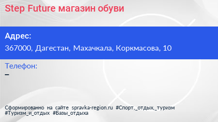 Step Future, магазин обуви по адресу 367000, Дагестан, Махачкала, Коркмасова, 10 в дальнейшем Организация, размещена в следующих категориях: