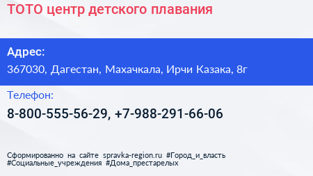 TOTO, центр детского плавания по адресу 367030, Дагестан, Махачкала, Ирчи Казака, 8г в дальнейшем Организация, размещена в следующих категориях: