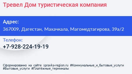Тревел Дом, туристическая компания по адресу 367009, Дагестан, Махачкала, Магомедтагирова, 39а/2 в дальнейшем Организация, размещена в следующих категориях: