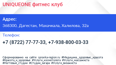 UNIQUEONE, фитнес-клуб по адресу 368300, Дагестан, Махачкала, Халилова, 32а в дальнейшем Организация, размещена в следующих категориях: