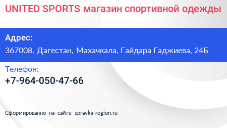 UNITED SPORTS, магазин спортивной одежды по адресу 367008, Дагестан, Махачкала, Гайдара Гаджиева, 24Б в дальнейшем Организация, размещена в следующих категориях: