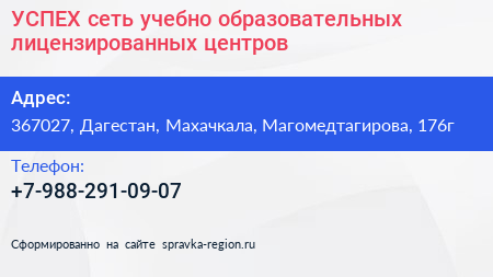 УСПЕХ, сеть учебно-образовательных лицензированных центров по адресу 367027, Дагестан, Махачкала, Магомедтагирова, 176г в дальнейшем Организация, размещена в следующих категориях: