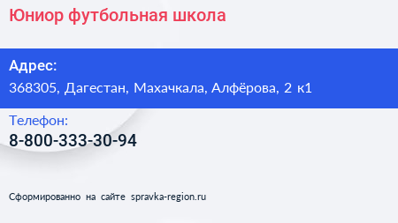 Юниор, футбольная школа по адресу 368305, Дагестан, Махачкала, Алфёрова, 2 к1 в дальнейшем Организация, размещена в следующих категориях: