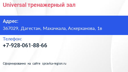 Universal, тренажерный зал по адресу 367029, Дагестан, Махачкала, Аскерханова, 1в в дальнейшем Организация, размещена в следующих категориях: