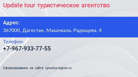 Update tour, туристическое агентство по адресу 367000, Дагестан, Махачкала, Радищева, 4 в дальнейшем Организация, размещена в следующих категориях: